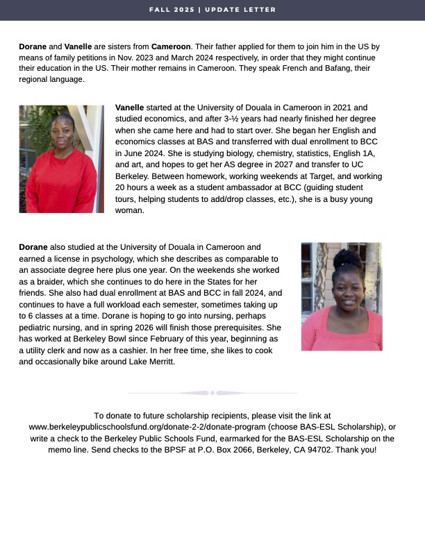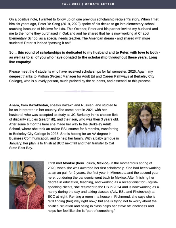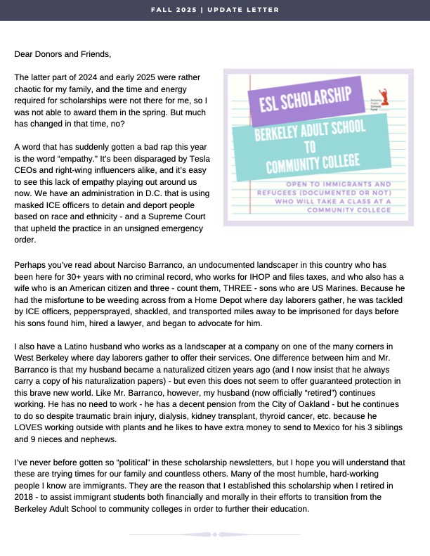 ESL Scholarship Berkeley Adult School to Community College Update!